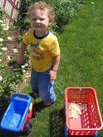 Judah has really taken a liking to helping Grammy & Grandad out in the yard. Here he is picking daisies and putting them in his wagon and dump truck. I came outside and saw him helping Grandad mow the yard and quickly ran to grab the camera for some video. Too cute!